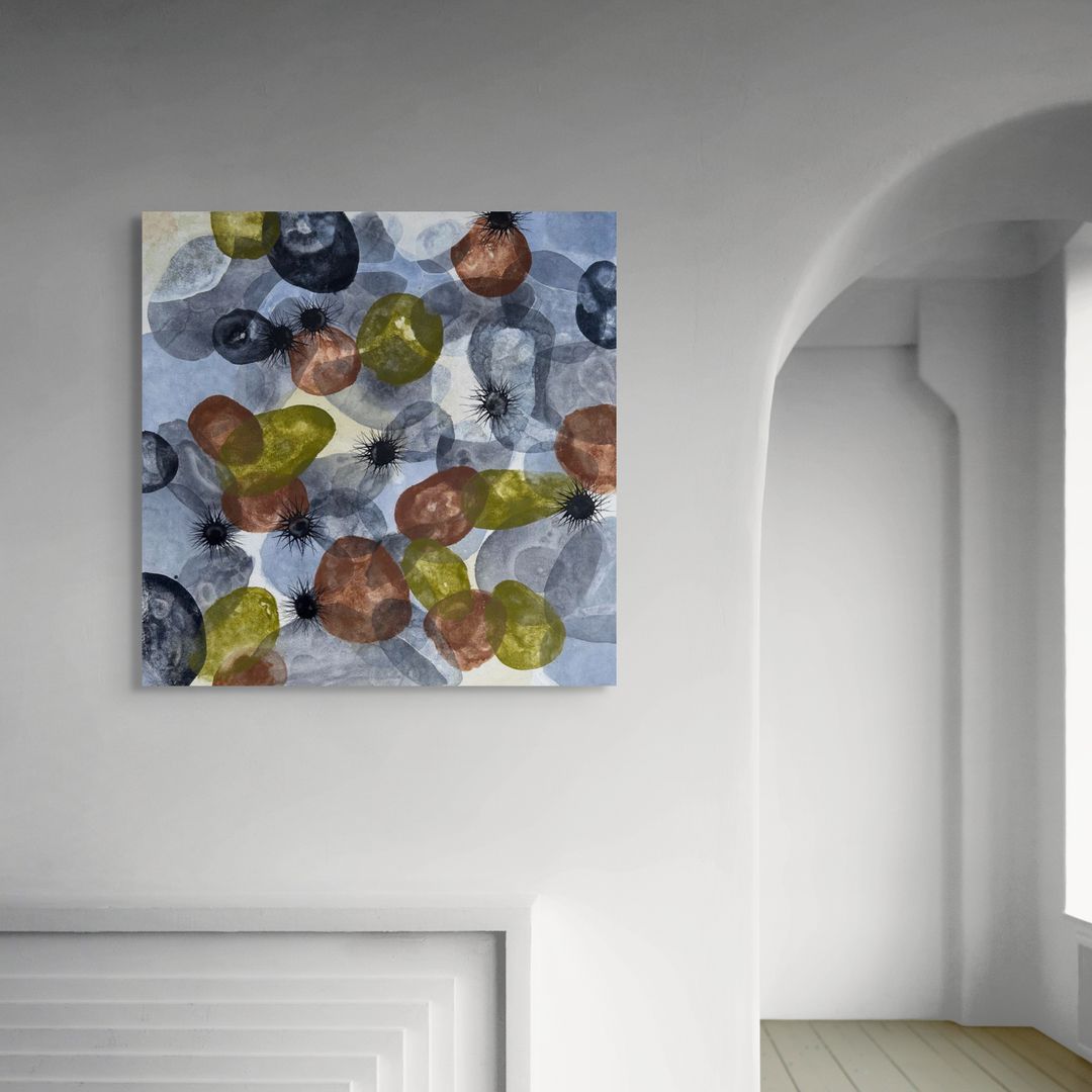 Urchins of Cala Grit is an abstract artwork inspired by the hidden marine world of the Costa Brava. Layered shapes in muted greens, rusts, and slate blues overlap like underwater reflections, while dark bursts of ink recall the delicate forms of sea urchins nestled among sand and stone.